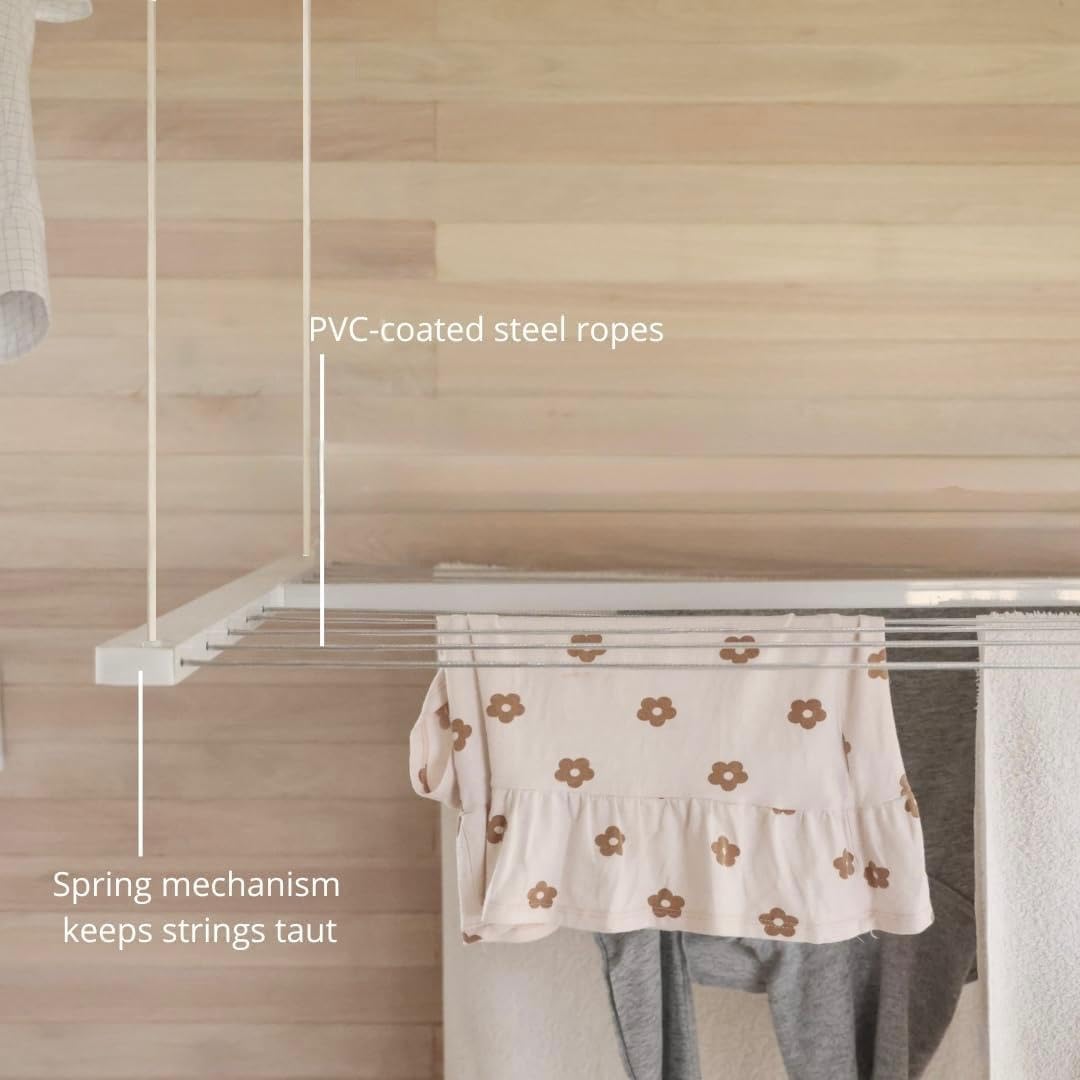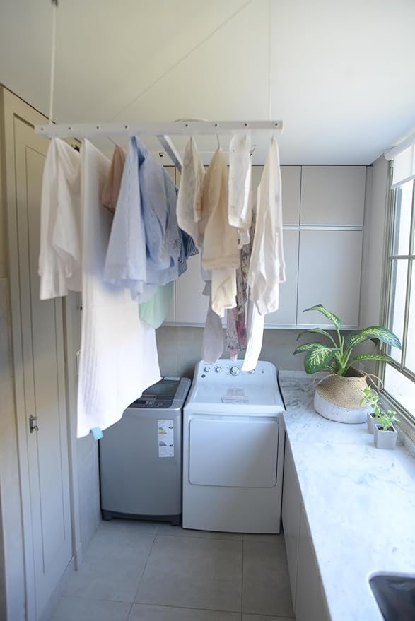 - FUNCIONALIDAD VERSÁTIL Y DE BAJO MANTENIMIENTO: Tiene capacidad para hasta 15 metros (22 kg) de ropa, ideal para familias o grandes cargas de ropa (la capacidad varía según el modelo). Diseñado para resistir la humedad y la intemperie sin dañarse ni oxidarse. Se instala fácilmente en varios tipos de techos: pladur, hormigón o techos inclinados de madera. Y lo mejor de todo, no requiere mantenimiento: solo instálelo y disfrute.
