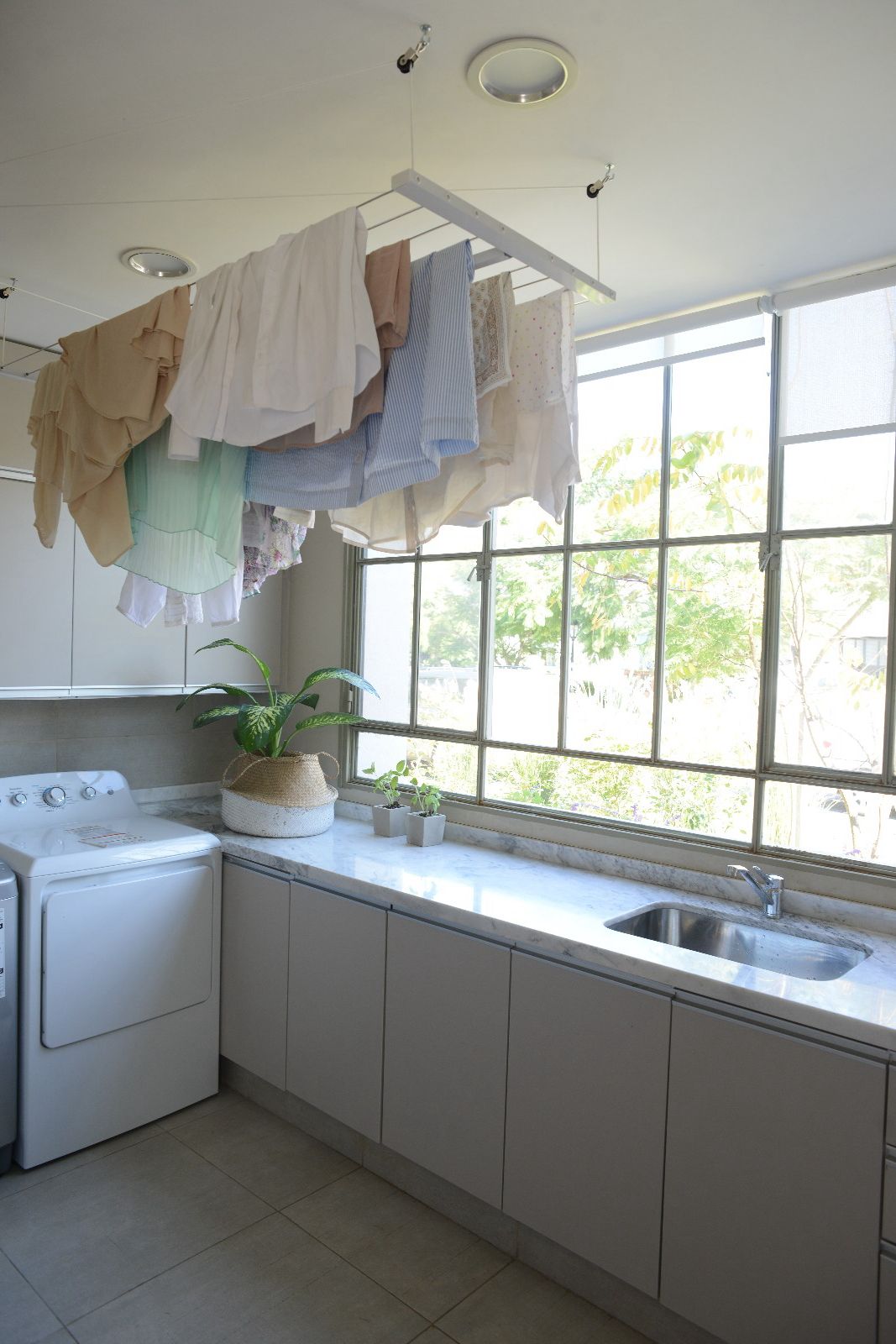 - MATERIALES DE ALTA CALIDAD – CONSTRUIDO PARA DURAR: Su construcción íntegramente en acero inoxidable garantiza máxima durabilidad y resistencia a la oxidación, incluso en ambientes húmedos. La manivela de acero pintada de blanco sube y baja el tendedero suavemente, sin bloquearse, gracias a un sistema integrado de poleas reductoras de peso. Equipado con 4 poleas robustas que distribuyen el peso uniformemente, lo que facilita subirlo y bajarlo, incluso con la carga completa.